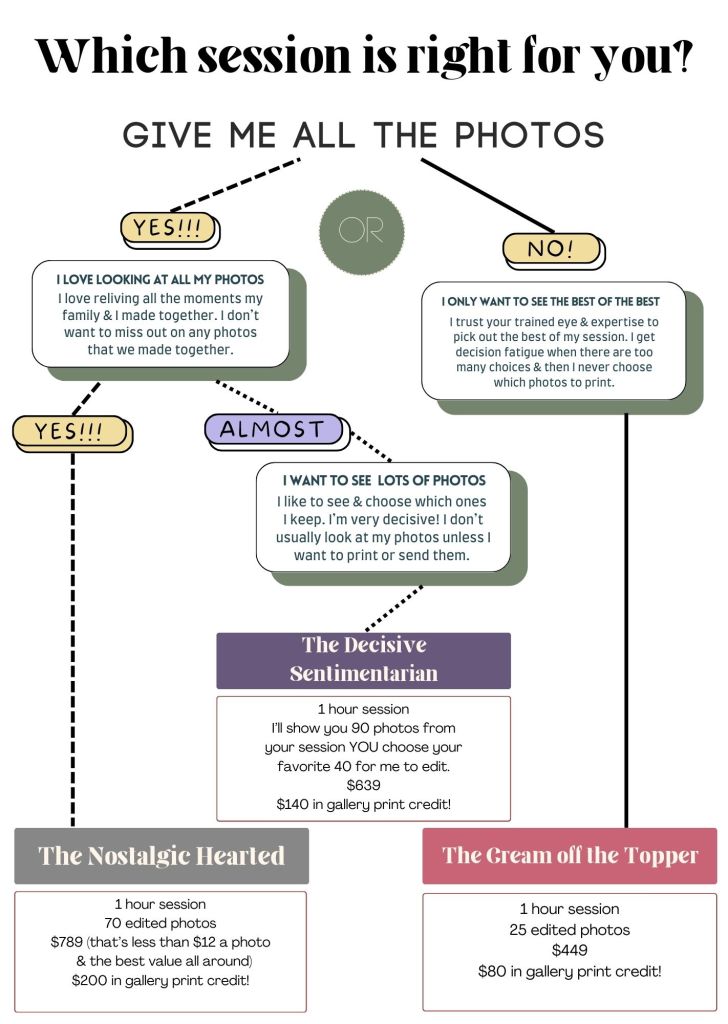 People still print their photos? What good are these treasures if they aren’t part of your home?! What we create together belongs on your walls or as a book on your coffee table, don’t ya think? I have a simple flow chart that you will get when you book your session. I will give you as much or as little guidance as you want.